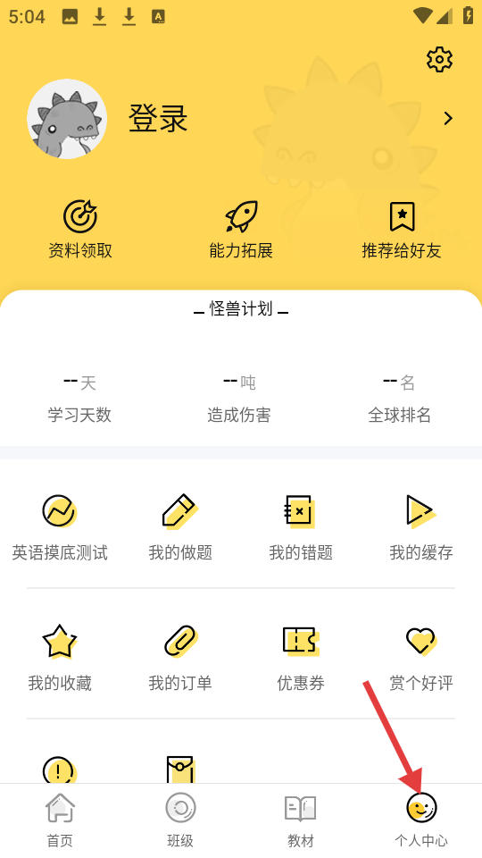 4、個人中心頁面顯示登錄入口,設有資料領取等功能,涵蓋英語摸底測試、錯題記錄等,方便用戶管理學習與獲取服務。