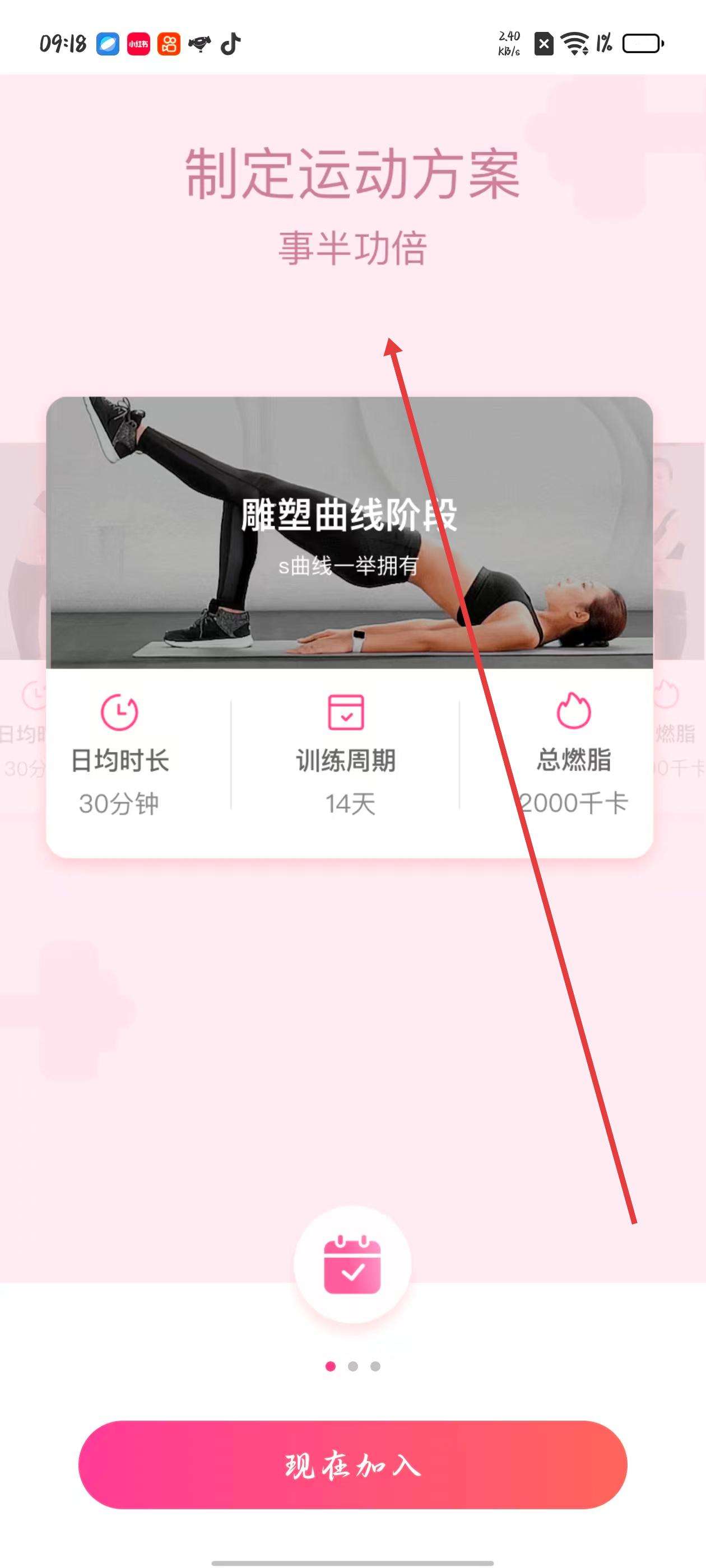 3、進入制定運動方案頁面,查看雕塑曲線階段的運動方案,了解日均時長、訓練周期和總燃脂量后點擊現在加入。