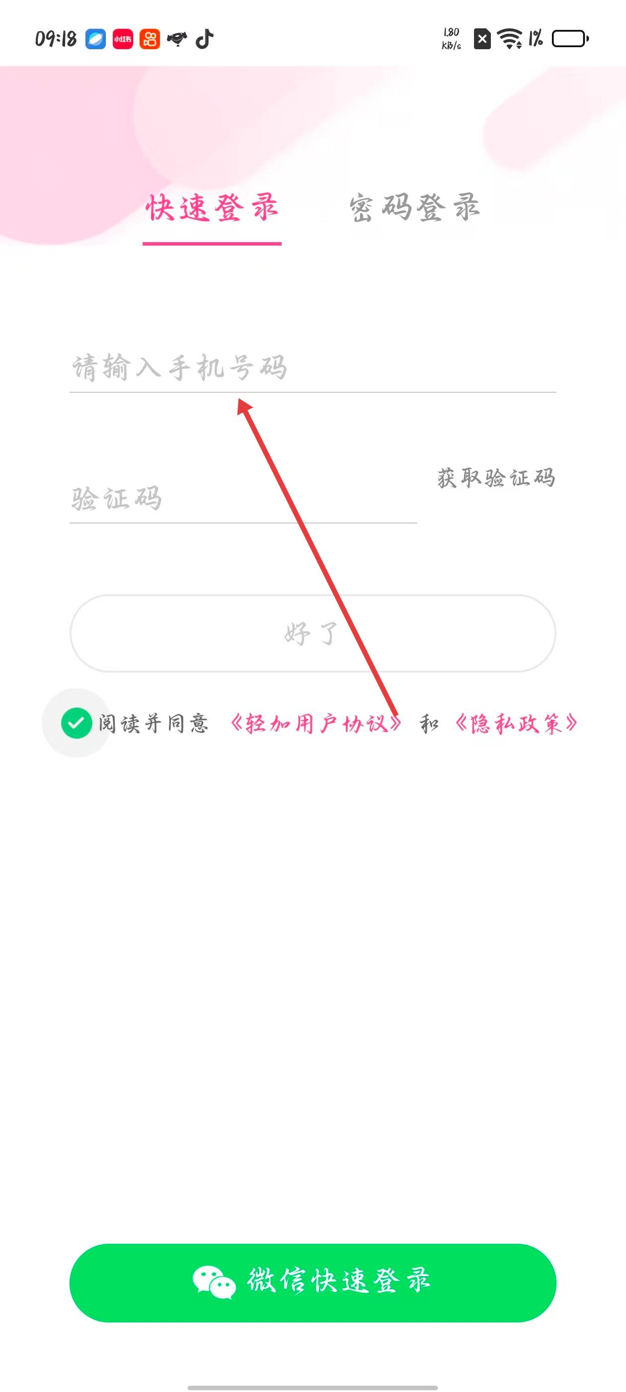 1、進入輕加APP登錄頁面,選擇快速登錄方式,輸入手機號碼,獲取驗證碼并填寫,閱讀并同意用戶協議和隱私政策后完成登錄。