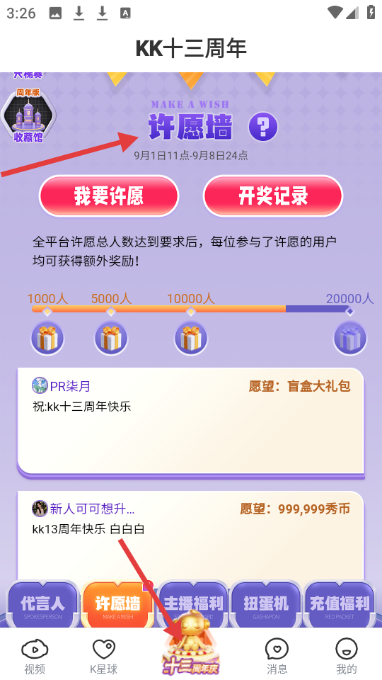 3、KK十三周年活動頁,許愿墻活動限時開啟,全平臺許愿人數達標有額外獎勵,展示用戶許愿內容有我要許愿等功能。