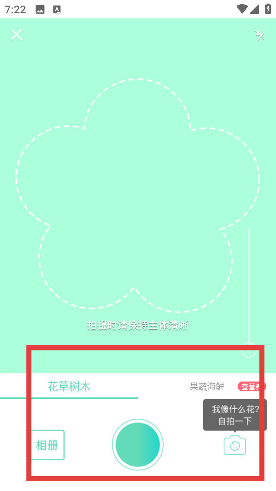 2、進入拍照界面后你可以選擇拍攝的類別,如花草樹木、果蔬海鮮等,然后你可以直接拍攝照片,或者點擊相冊按鈕,從手機相冊中選擇需要識別的圖片。