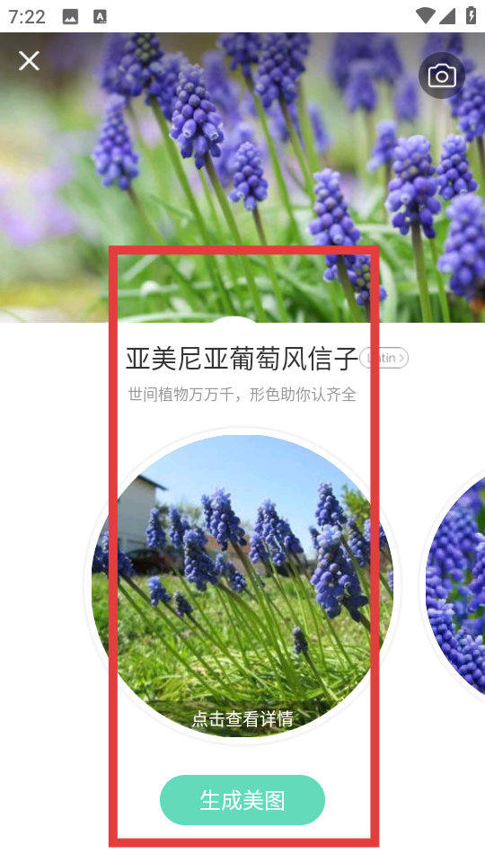 3、拍攝或選擇好照片后,APP會自動進行識別并顯示識別結果,想了解更多關于該植物的內容,可以點擊點擊查看詳情按鈕,還可以點擊生成美圖按鈕制作精美圖片。