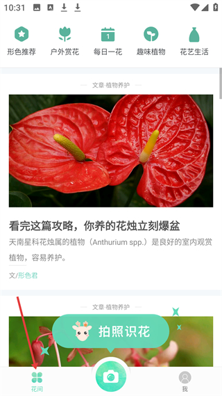 1、花間板塊有植物養護攻略,如花燭爆盆技巧,還有拍照識花功能,涵蓋形色推薦、戶外賞花等板塊,滿足植物識別與養護需求。