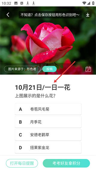 3、每日一花板塊10月21日推出花卉識別題,展示帶露珠的花卉,選項含月季花等,可投稿、考考好友拿積分,助力花卉知識學習。