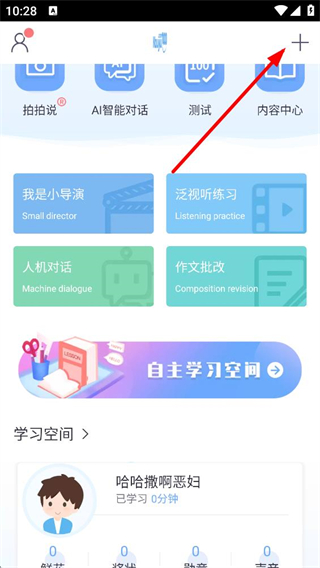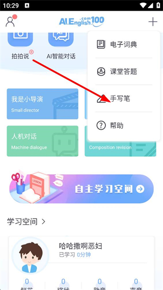 1、進入應用主界面,可使用拍拍說、智能對話等功能,還有我是小導演、泛視聽練習等學習模塊,也能進入自主學習空間開展學習。