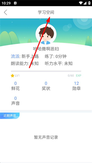 4、進入學習空間頁面,可查看個人學習數據,包括流派、練習時長、朗讀能力等信息,還能查看鮮花、勛章等學習成就數據。