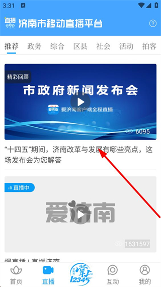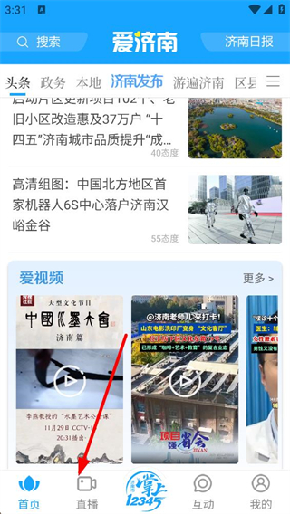 1、進入應用首頁可瀏覽頭條政務等板塊的濟南本地資訊,查看愛視頻欄目內容,點擊底部直播選項,進入濟南市移動直播平臺界面。