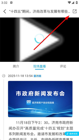 3、發布會詳情頁可查看現場直播內容,切換至簡介或評論標簽頁,了解發布會的時間主題等信息,獲取相關公開內容。
