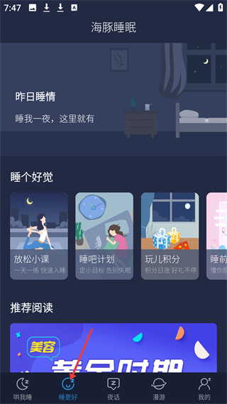 2、睡更好頁可查看昨日睡情,設有放松小課、睡吧計劃等實用功能,還有推薦閱讀板塊,多維度幫助用戶提升睡眠質量。