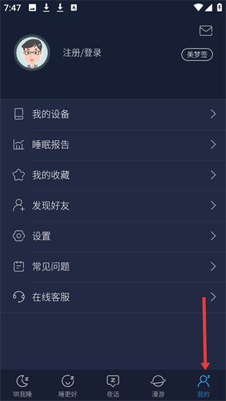 4、我的頁可進行注冊登錄,管理我的設備、睡眠報告等,還有設置和在線客服功能,方便用戶管理個人睡眠事務。