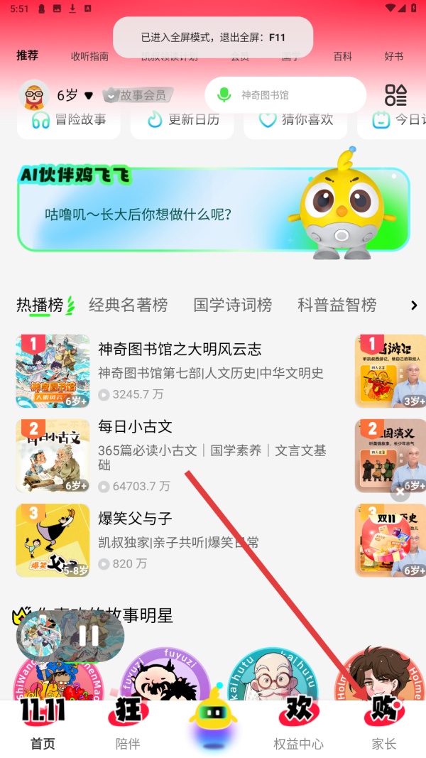 1、打開凱叔APP,首頁點擊右下角家長選項,進入家長相關界面。
