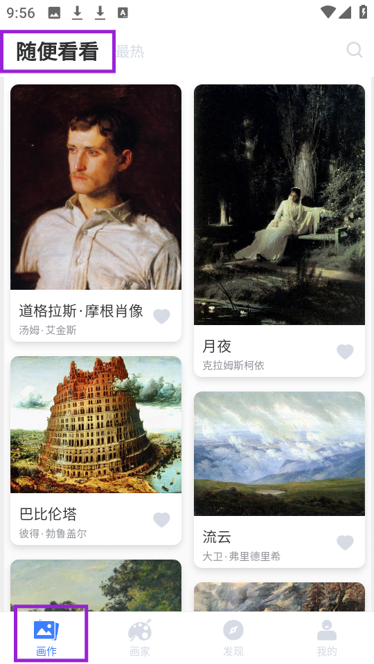 1、畫作界面隨便看看中呈現多幅經典,像道格拉斯摩根肖像等,手指輕點即可開啟藝術鑒賞。