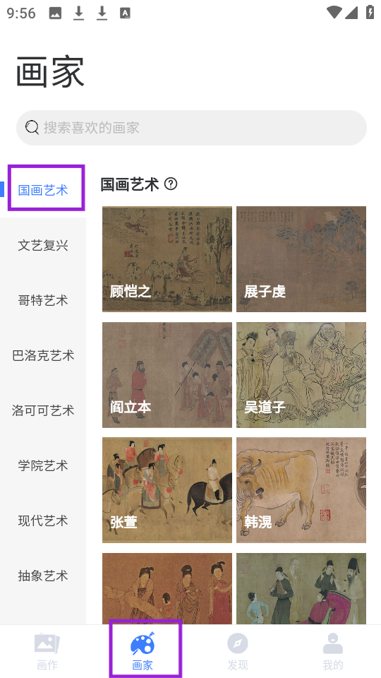 2、畫家頁面設有搜索欄,國畫藝術集合顧愷之等大家,展示傳統國畫之美感受東方藝術神韻。
