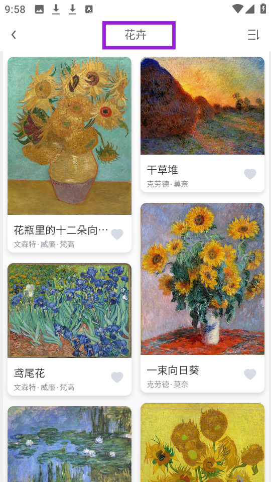 4、花卉頁面陳列梵高、莫奈筆下的花卉之作,色彩斑斕的花卉繪畫,盡顯自然與藝術融合之妙。