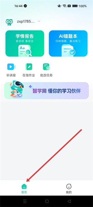 1、進入首頁可查看學情報告、AI錯題本等功能入口,還有聽講座、在線作業等服務,可根據需求使用學習功能。