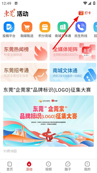 2、點擊底部活動按鈕,進入活動頁面,可看到投稿平臺、融媒甄選等功能入口,還有東莞熱聞榜、全媒體矩陣等板塊,右上角有打卡功能,可參與各類活動。