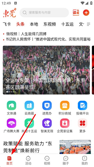 1、進入APP首頁,可見飛卡、頭條等內容分類,還有文體通、云商圈等功能入口,底部有首頁、活動等功能導航欄,可瀏覽本地資訊和各類服務。