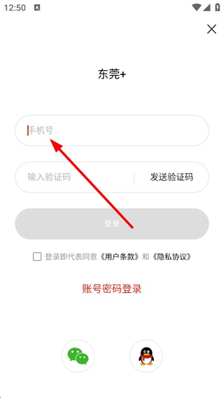 3、若登錄,輸入手機號,發送并輸入驗證碼,勾選同意用戶條款和隱私協議后點擊登錄,也可選擇賬號密碼登錄或微信、QQ登錄。