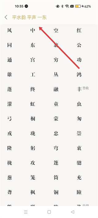 3、進入平水韻平聲一東界面,可看到該韻部包含風、中、空、紅等諸多漢字,點擊其中漢字如中可查看其詳細釋義。