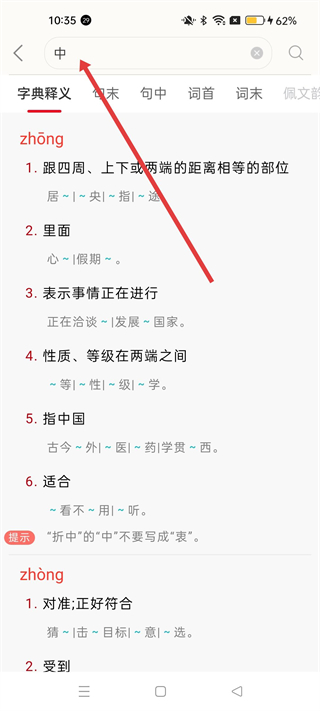 4、漢字釋義界面,可查看中字的讀音、不同讀音下的釋義,表示跟四周距離相等的部位等,表示對準等,幫助深入理解詩詞用字。