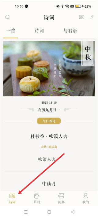1、進入詩詞界面,可查看今日薦詩,底部有詩詞、茶刊、韻典、我的功能入口,點擊韻典可進入韻典板塊。