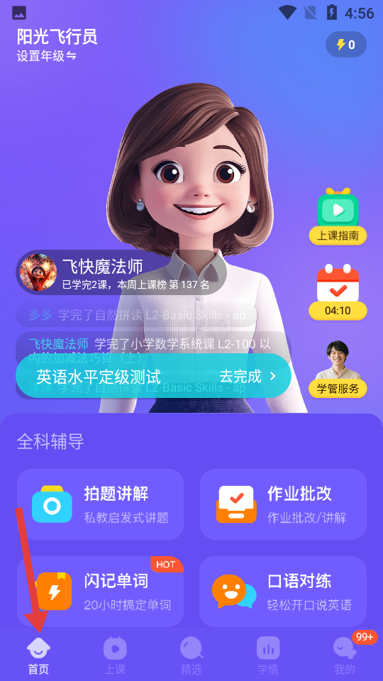 1、首頁能設置年級呈現用戶學習情況與排名,提供英語水平定級測試,具備拍題講解等全科輔導功能。
