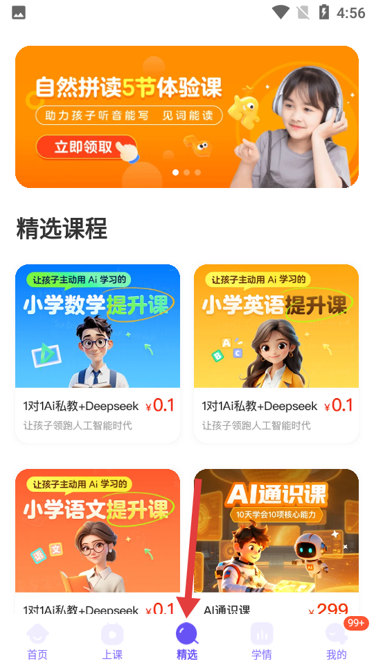 3、精選頁面推送自然拼讀體驗課,羅列小學數學、英語、語文提升等精選課程部分課程低價體驗。