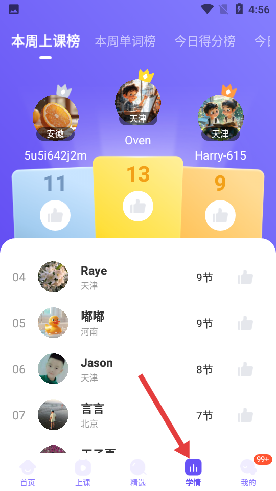 4、學情頁面展示本周上課榜等榜單,呈現各地同學上課節數等信息方便了解學習競爭情況。