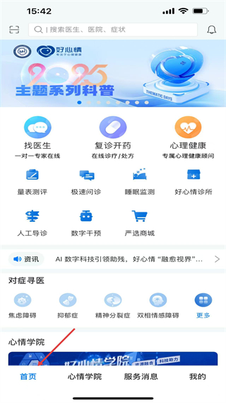 2、首頁有找醫生、復診開藥等功能,對癥尋醫涵蓋焦慮、抑郁等,還有心情學院入口,提供多維度心理健康服務。
