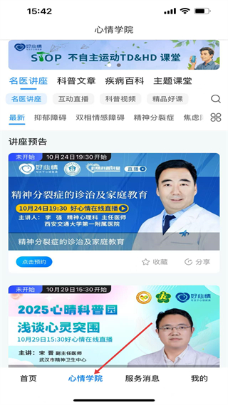 3、心情學院有名醫講座、科普文章等,講座預告有精神分裂癥診治直播,內容專業,助力用戶學習心理知識。