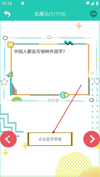 2、在無厘頭題目頁面閱讀顯示的問題,思考對應的答案,若無法想出,點擊頁面中的點擊顯示答案按鈕,查看該題的正確答案。
