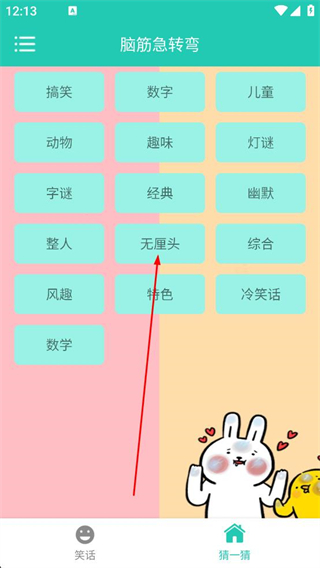 1、打開笑話大王軟件進入主界面,選擇無厘頭分類選項,點擊進入無厘頭題目頁面,可看到當前題目的序號及具體問題內容。