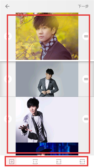 2、用戶進入拼接界面后,可從相冊中選擇多張圖片,底部有不同比例的拼圖尺寸選項,選擇合適的尺寸進行拼圖。
