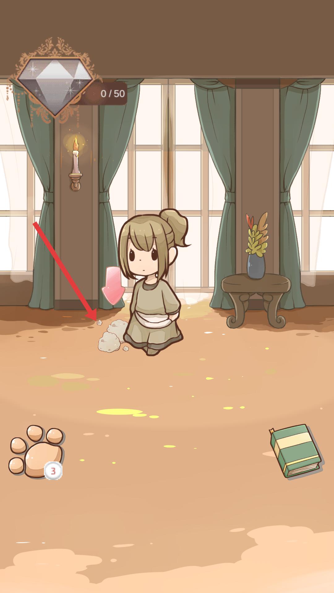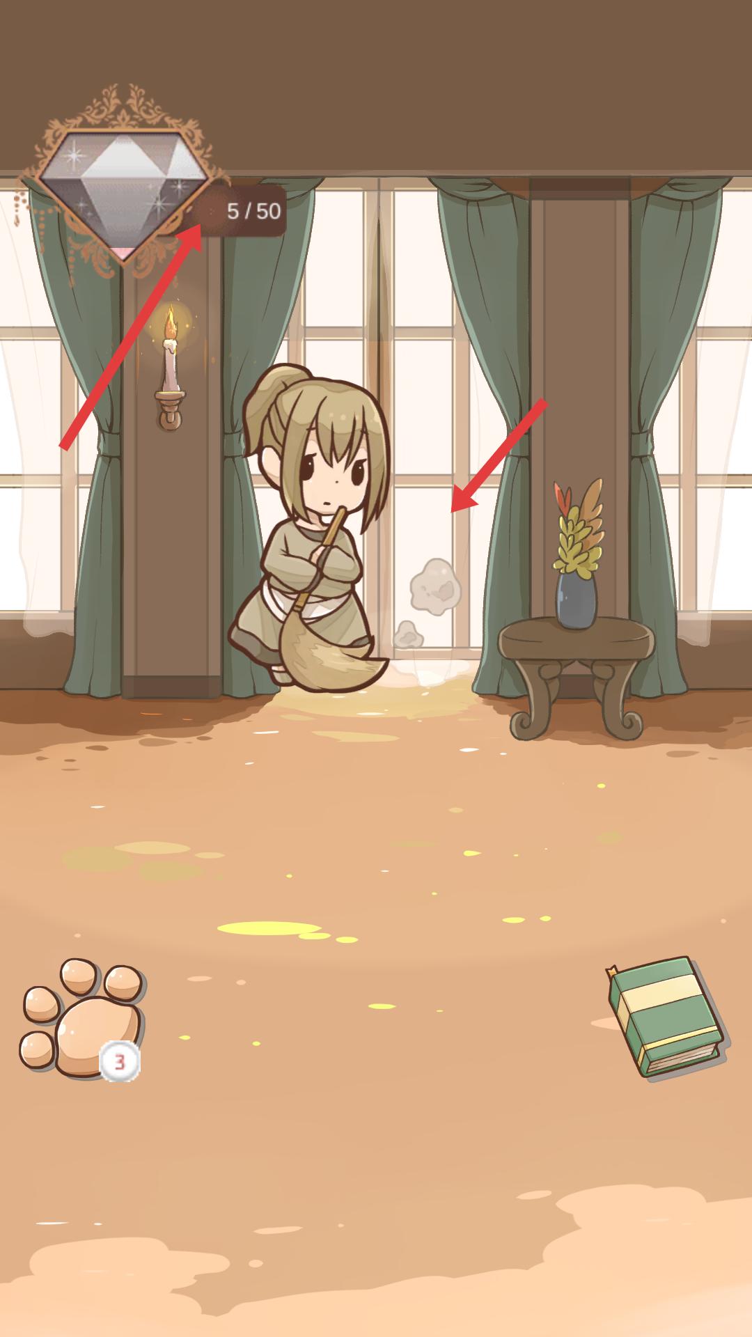 2、角色手持掃帚,可操控角色用掃帚清理場景中的灰塵等雜物,清理后鉆石進度會提升,持續清理,朝著收集50個鉆石的目標前進。