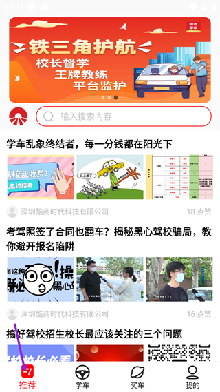 1、進入推薦頁面可查看學車相關資訊,包含學車亂象整治、駕校騙局揭秘、駕校招生建議等內容,資訊由深圳酷商時代科技有限公司發布,標注了對應點贊數量。