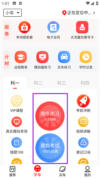 2、進入學車頁面可使用多種學車功能,含考場提前看、電子合同等服務類功能,還有遠程教育等計時類功能,科一板塊提供順序練習、模擬考試等練習方式。