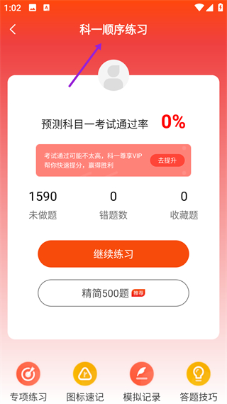 3、進入科一順序練習頁面可查看考試通過率預測,顯示未做題、錯題、收藏題數量,可選擇繼續練習或精簡500題,還有專項練習等輔助答題功能。