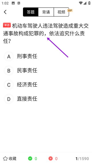 4、進入科一答題頁面可進行單選題練習,提供答題、背誦、視頻等模式,可對題目進行收藏操作,同時顯示當前答題的進度情況。