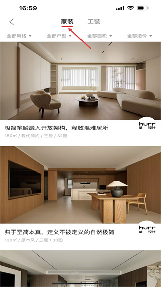 3、家裝頁展示現代簡約、原木風等家裝案例,如150極簡風格居所、120㎡自然極簡居所,呈現多樣家裝設計風格。
