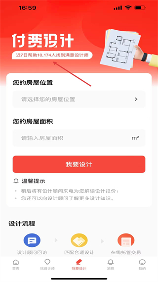 4、付費設計頁可選擇房屋位置、面積申請設計,近7日幫助超萬人找到滿意設計師,設計流程含顧問回訪、匹配設計等環節。