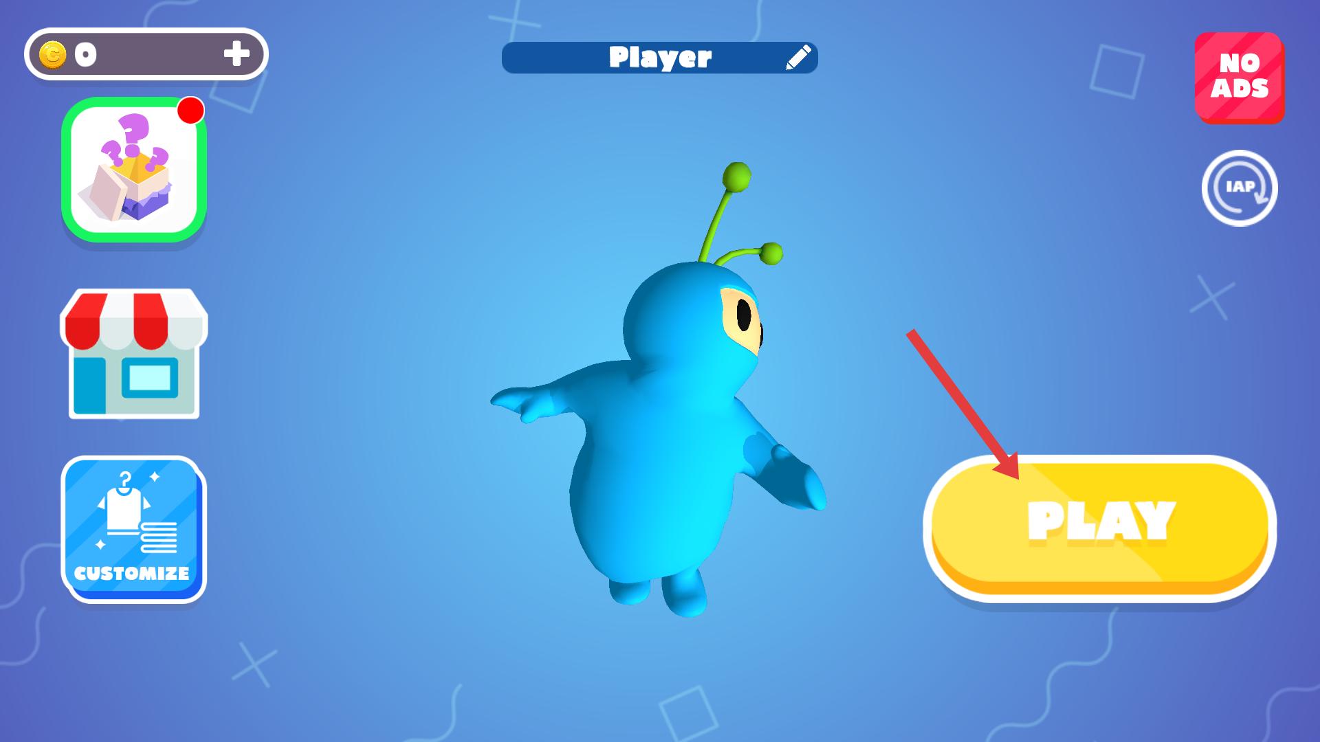 1、游戲主界面,有藍色角色和多個功能按鈕,點擊右側PLAY按鈕,即可進入游戲,開啟闖關之旅。