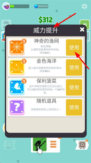 4、打開威力提升界面,選擇神奇的漁網等道具,點擊使用按鈕激活道具,借助道具的效果,更高效地捕獲魚類獲取獎勵。