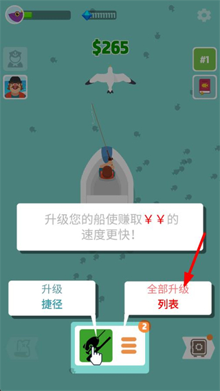 3、界面提示升級船能加快賺貨幣的速度,點擊升級相關按鈕,消耗資源提升船的等級,提升后續撈魚獲取貨幣的效率。