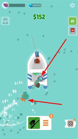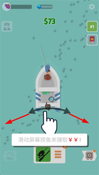 1、根據提示滑動屏幕撈魚來賺取貨幣,按照指引滑動屏幕,操控撈魚工具捕獲魚類,積累游戲內的貨幣資源。