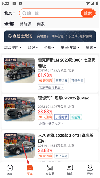 3、買車頁提供二手車列表,含車型、價格等信息,支持篩選排序,是用戶選購經過檢測的二手車的核心頁面。