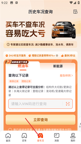 4、查車況支持燃油新能源車的歷史記錄查詢,輸入VIN碼可查維保、理賠信息,助力用戶規避購車風險。