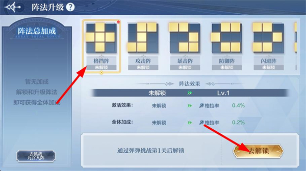 2、在陣法升級界面,可看到格擋陣等陣法選項,通過彈彈挑戰1關后點擊去解鎖,即可開啟對應陣法獲得全體加成。