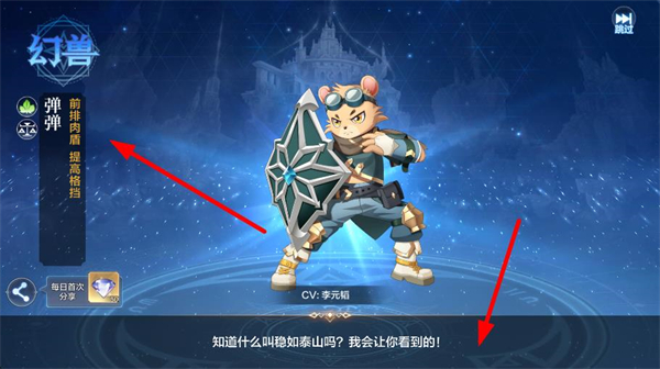 4、查看幻獸彈彈的界面,了解其是前排肉盾負責格擋,同時會顯示其配音信息,還有對應的臺詞展示角色特點。