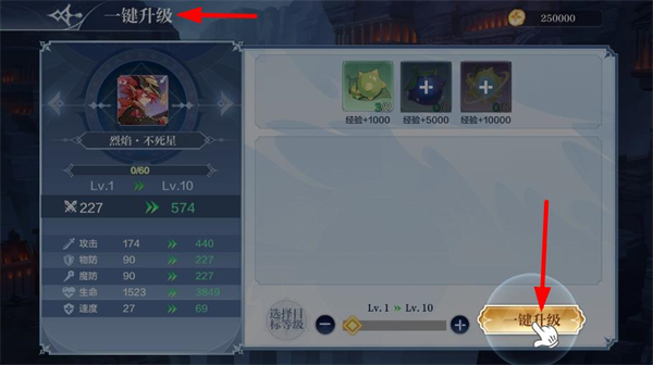 1、進入精靈升級界面,選擇烈焰不死星,可點擊一鍵升級按鈕,消耗對應道具提升其等級,同時屬性也會隨之增長。