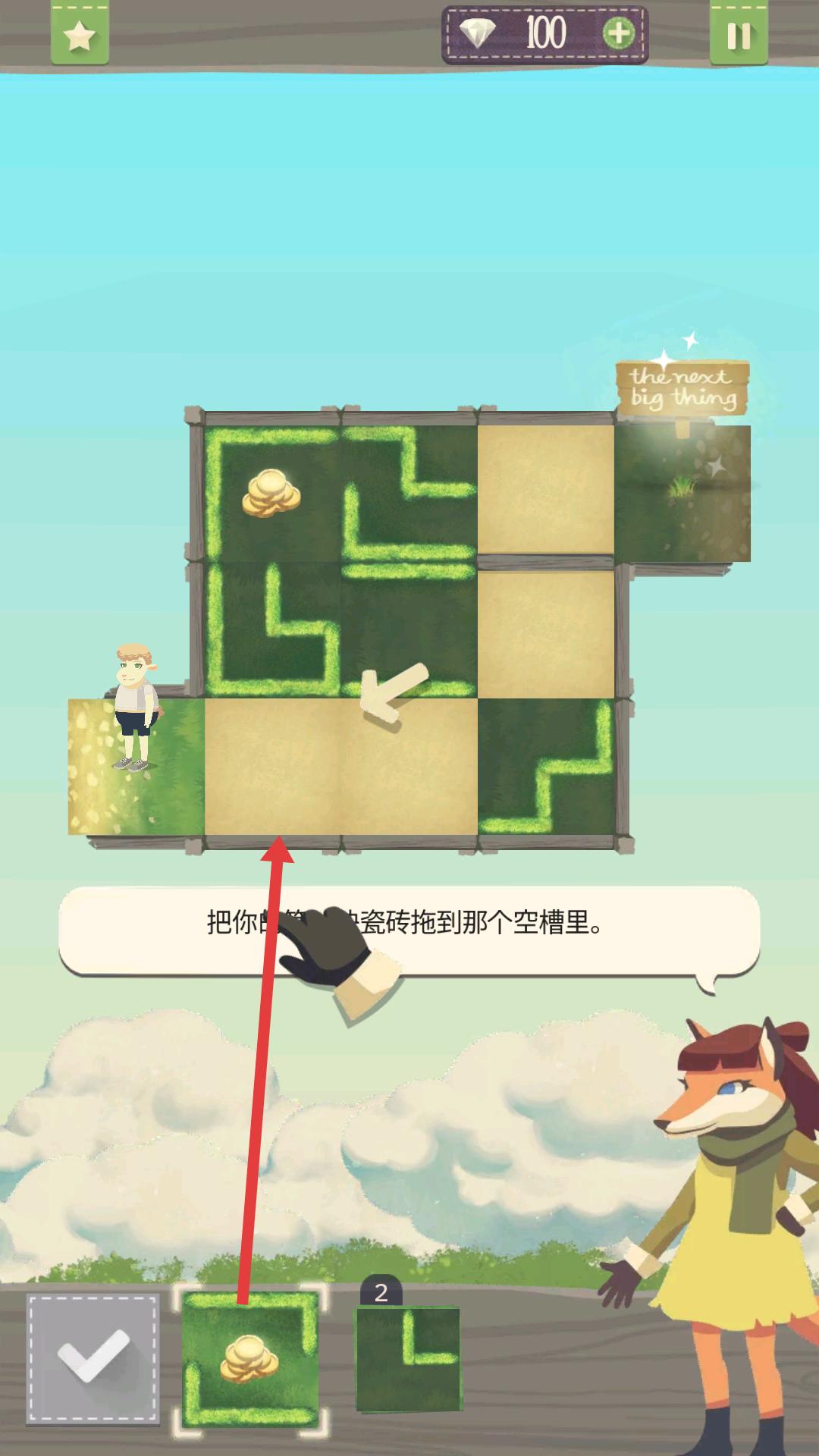 2、按照提示,把帶有金幣的瓷磚拖到空槽里,這樣能搭建路徑,讓羊可以沿著路徑移動,去尋找新鮮時髦事。